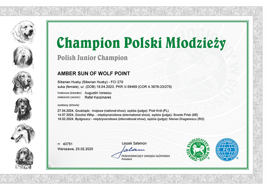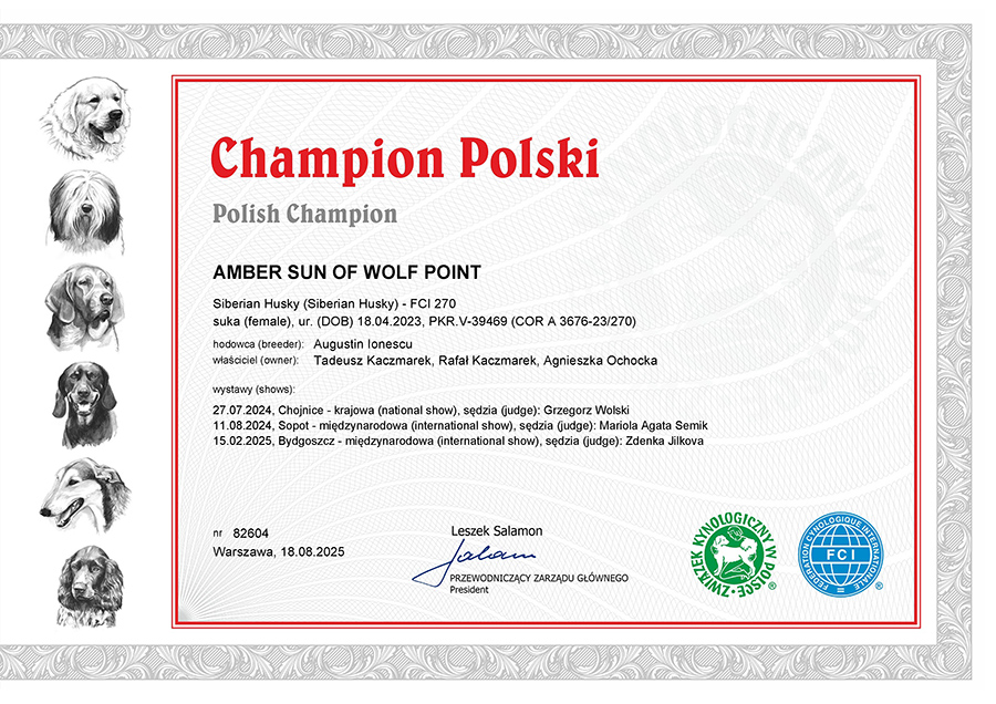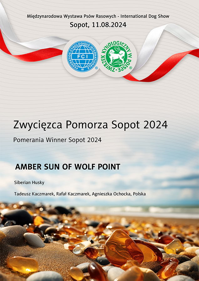 Siberian Husky - AMBER SUN of Wolf Point SUKCESY (kliknij na miniaturze żeby zobaczyć powiększenie) MŁODZIEŻOWY CHAMPION POLSKI CHAMPION POLSKI ZWYCIĘZCA POMORZA Sopot 2024